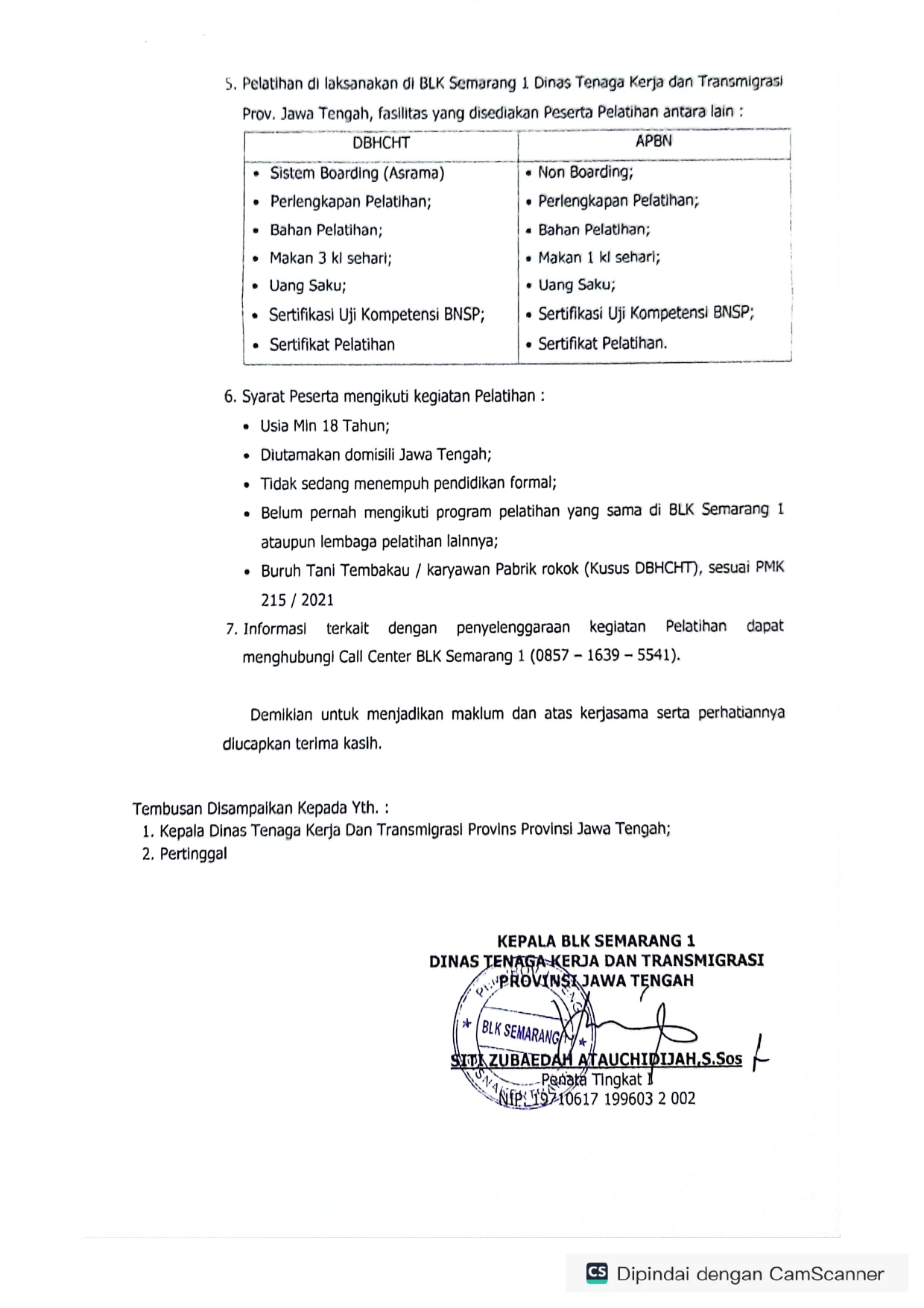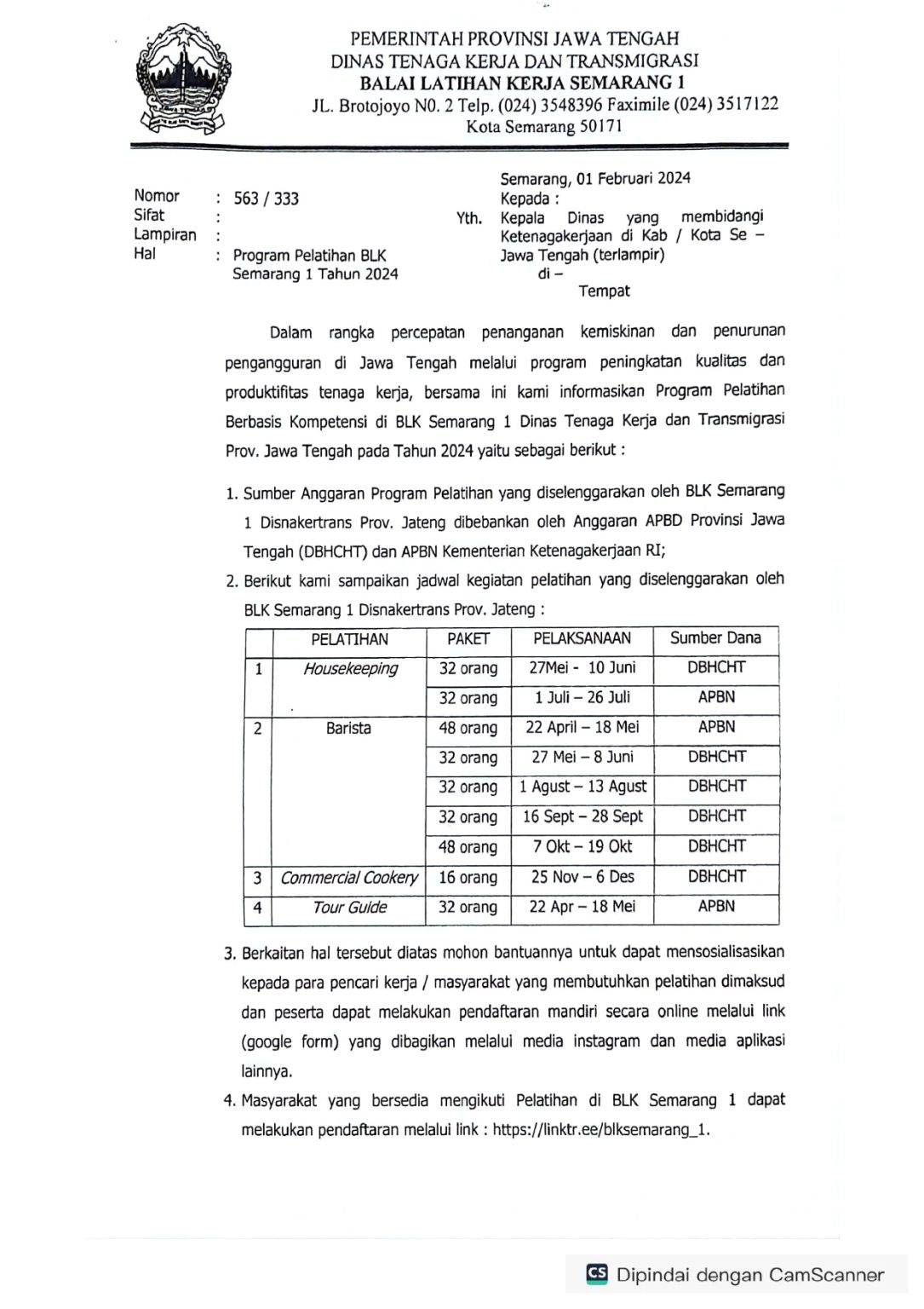 Dalam rangka percepatan penanganan kemiskinan dan penurunan angka pengangguran di Provinsi Jawa Tengah melalui Program Peningkatan Kualitas dan Produktivitas Tenaga Kerja. Balai Latihan Kerja (BLK) Semarang 1 Dinas Tenaga Kerja dan Transmigrasi Provinsi Jawa Tengah membuka pendaftaran Pelatihan Berbasis Kompetensi Tahun 2024 sebagai berikut :